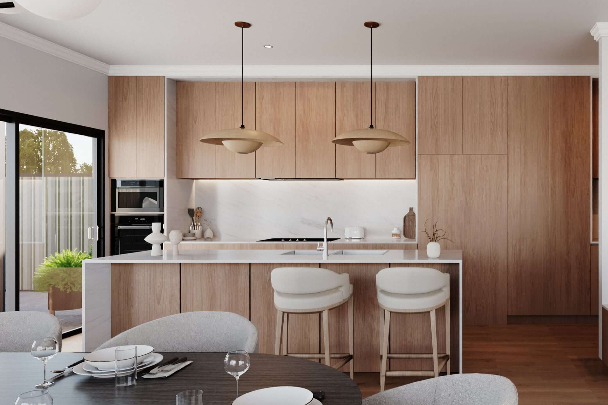 North positioned open-plan living and dining areas and outdoor spaces